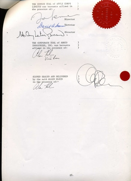 According to Moments in Time, which is selling the settlement papers for $95,000, “On the day that the suit was settled, John Lennon and Yoko Ono, [Klein], and a group of the attorneys from both parties assembled in a suite at the Plaza Hotel . . . Photographer Bob Gruen . . . took several photographs, including some shots of John, Yoko and Klein sharing a limo and also posing with the newly signed document resting on a large loaf of bread, signifying that they were . . . making peace.”